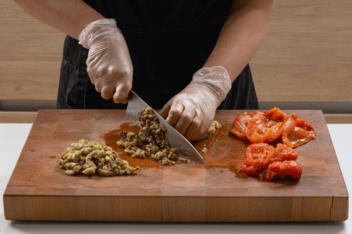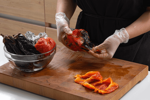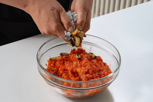 Peel the cooked eggplants and tomatoes, also peel the peppers and remove the seeds.