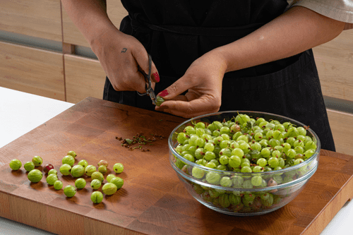 Remove the stem and dry tip from the gooseberries. Then wash the berries.