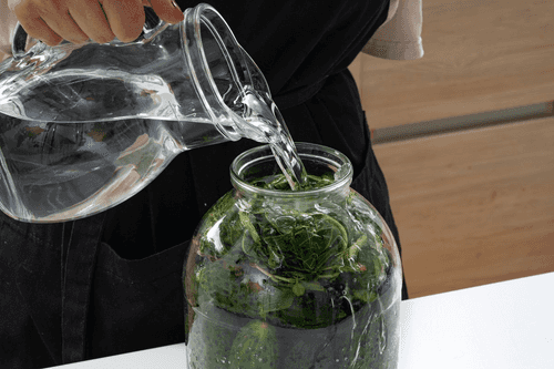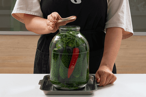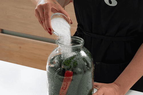 Cover the jar with a lid, place it in a tray (excess liquid may occur during fermentation) and leave it at room temperature for a day. Then put it in the refrigerator for about 3 days; the brine will first become cloudy and then clear.