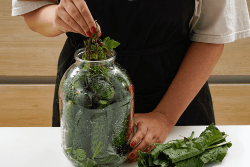 Place a portion of leaves, dill, and crushed garlic cloves at the bottom of the jar.
