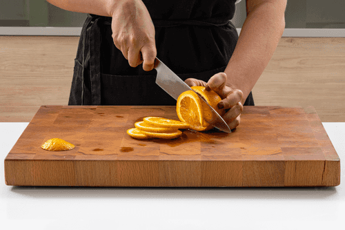 Wash the oranges (and scald with boiling water if there is a wax coating). Cut into slices, discard the ends. Place the slices in a jar.