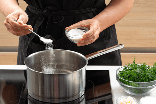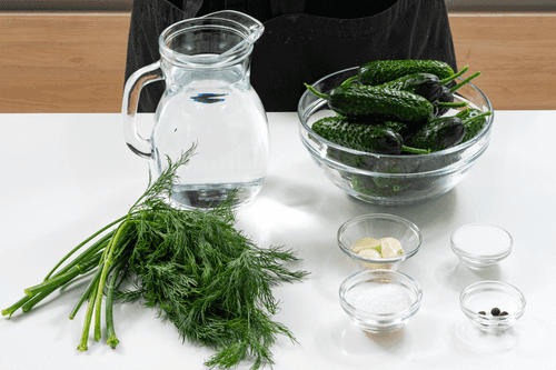 Pour water into a saucepan, add garlic, dill, pepper, salt, and sugar.