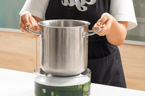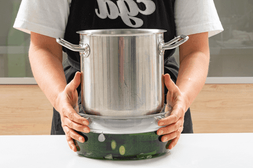 Cover the cucumbers with a plate and place a weight on top.