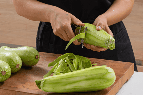 Peel the zucchini and cut it randomly.