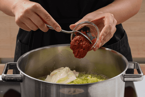 Transfer the zucchini puree to a pot, add tomato paste and mayonnaise.