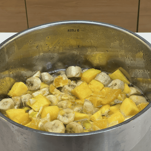 Mango jam with bananas, oranges, lime, and lemon is ready.