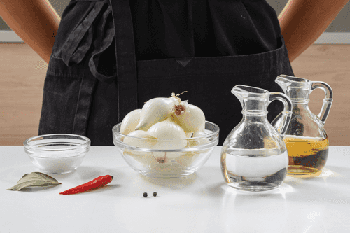 Dry the onions on paper towels and place them in sterilized jars. Add black pepper, chili pepper, and bay leaf.