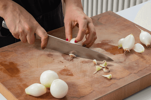 Peel the onions and trim the tails.