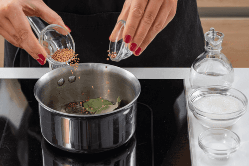 In a pot, mix water, vinegar, sugar, salt, and spices.