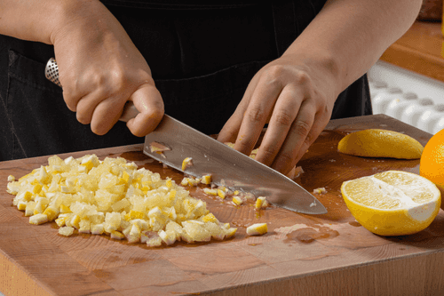 Cut lemons and oranges into small pieces with the peel.