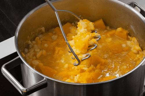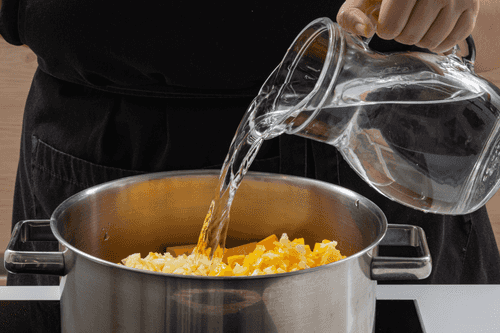 Bring to a boil and simmer for 40 minutes. The citrus peel should soften, and the pumpkin should become soft. Mash the pumpkin with a potato masher directly in the pot.