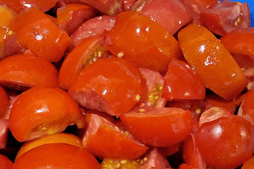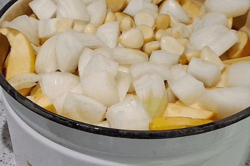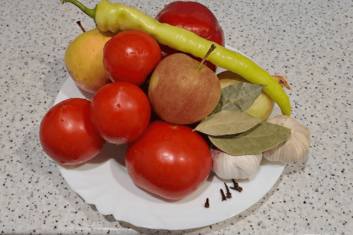 Place tomatoes and apples in a pot where the ketchup will be cooked. Add coarsely chopped onion and peeled garlic to the pot.