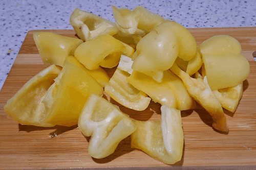 Cut the sweet pepper into large squares or wedges and add it to the pot with the vegetables.