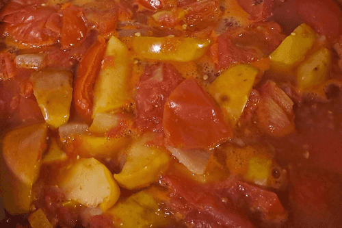 Place the pot on the fire. Bring to a boil and simmer for about 1.5 hours with the lid off, stirring occasionally to prevent the vegetables from burning.