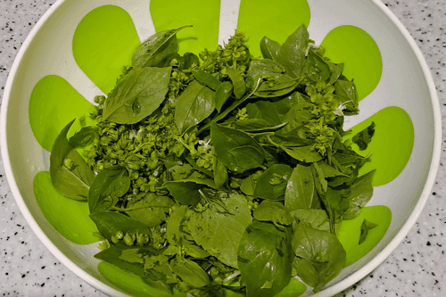 Tear the basil leaves and flowers and place them in a bowl.