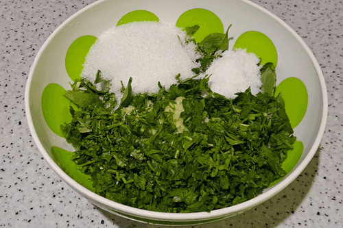 Pour 80 grams of sugar into the container with the prepared greens and garlic.