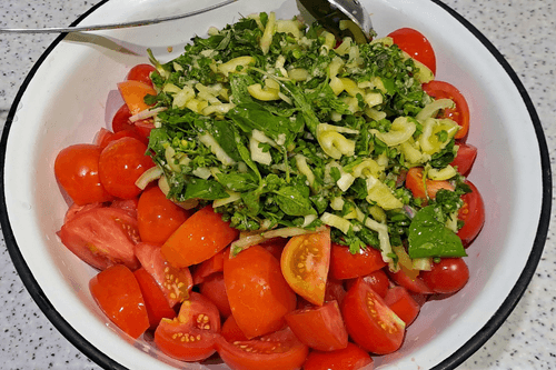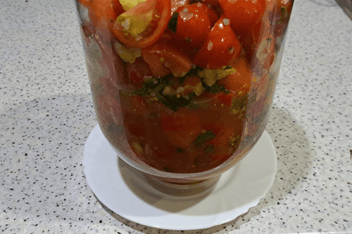 Place the prepared herbs with garlic and peppers in the container with tomatoes. Mix gently.