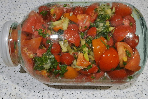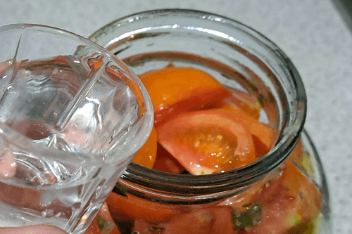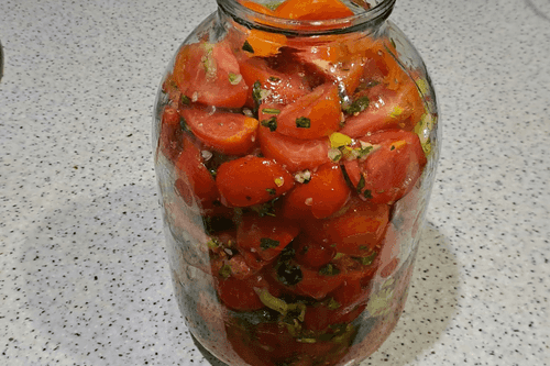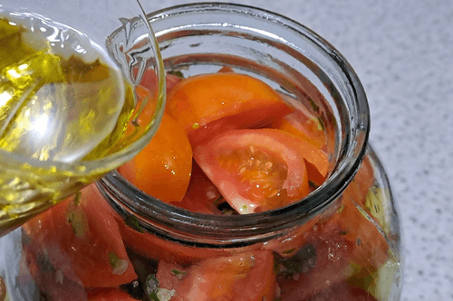 Seal the jar of tomatoes tightly with a lid. Turn it over several times or roll it on the table to evenly distribute the vegetable oil and vinegar.