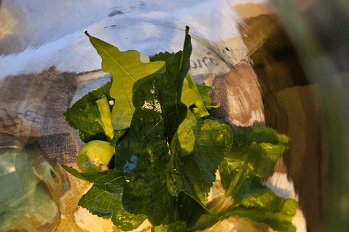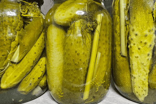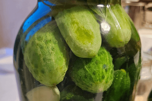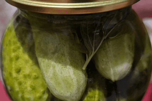 Cucumbers marinated with oak leaves and currants