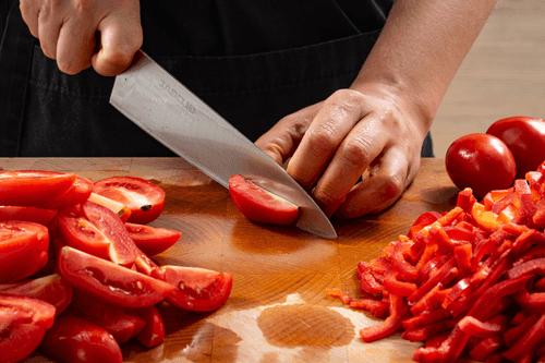Remove the seeds from the pepper and cut it into strips. Cut the tomatoes into wedges.