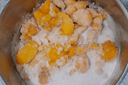 Add 600 grams of sugar to the peaches.
