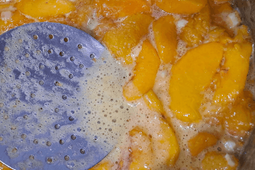 Place the pot with peaches on the fire, bring to a boil, and boil for about 10-15 minutes, stirring occasionally and skimming off the foam.