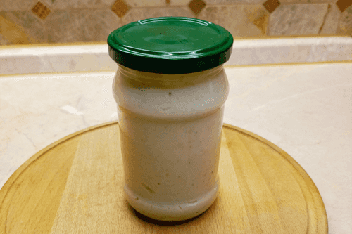 Transfer the mayonnaise to a storage container and keep it in the refrigerator for no more than a week.