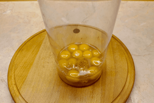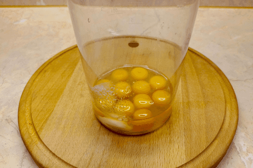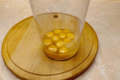 Crack the eggs and carefully place them in a mixing bowl, ensuring the yolks remain intact. Important: the mixing bowl should match the size of the blender or be slightly larger.