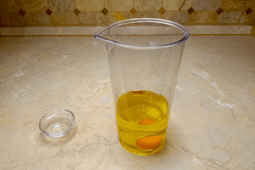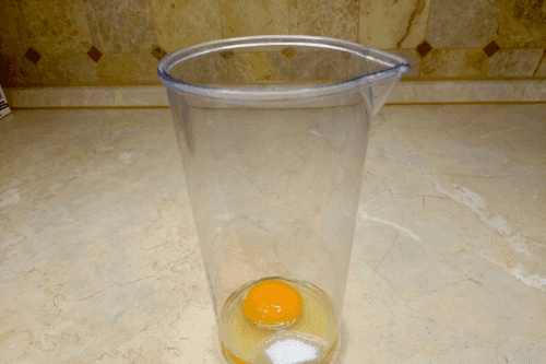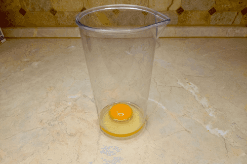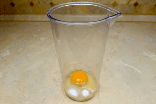 Crack the egg and carefully place it in a mixing bowl, ensuring the yolk remains intact. Important: the mixing bowl should match the size of the blender or be slightly larger.