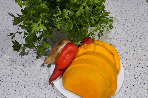 Cut the prepared pumpkin into small sticks or cubes and place it in a container with sweet pepper and parsley.