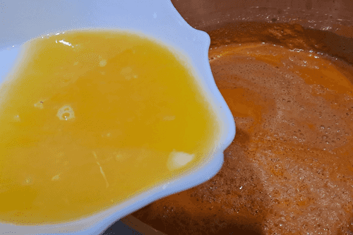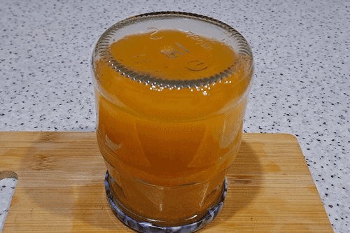 Pour orange juice into the container with pumpkin juice.