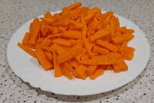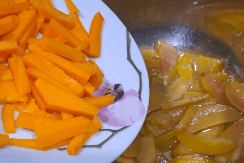 Peel the pumpkin and remove the seeds, then cut it into strips.