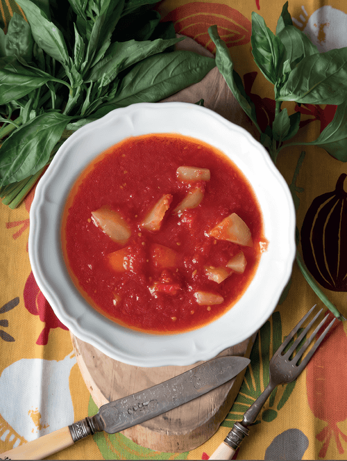 Remove the stems, seeds, and white partitions from the sweet pepper. Cut the pepper into small squares and add to the hot tomato mixture.