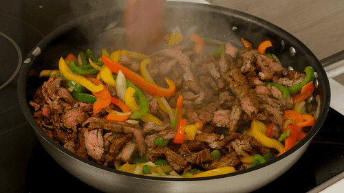 Add meat, salt, pepper, and cumin. Quickly fry to keep the vegetables crispy.