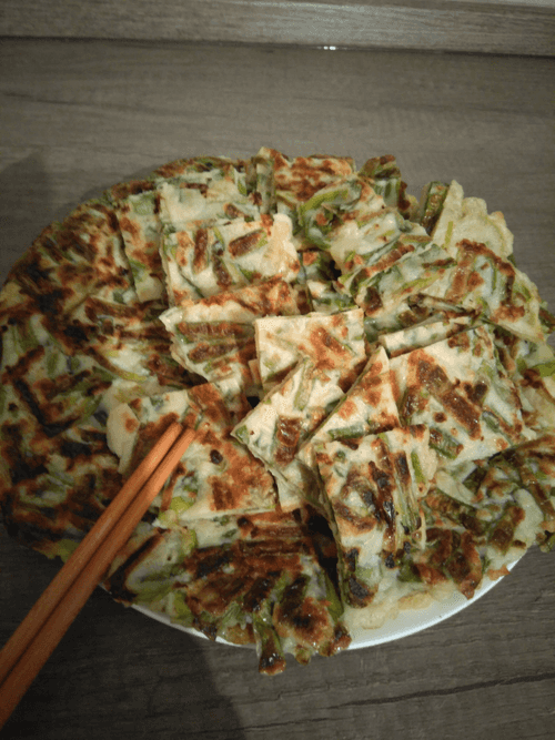 Cut the ready pancakes into small slices. Eat the pancakes by dipping them in soy sauce.