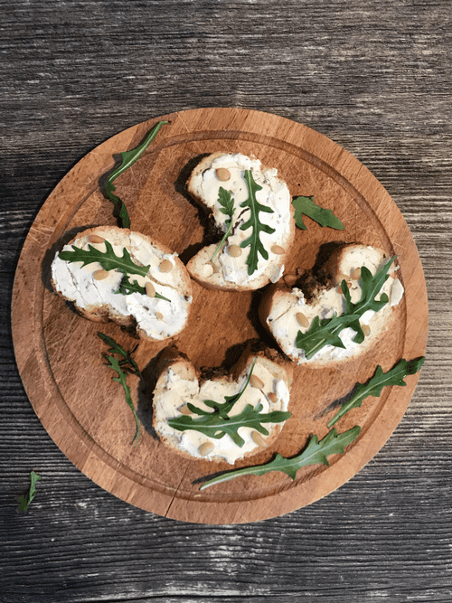Bruschetta with cream cheese, arugula and pine nuts