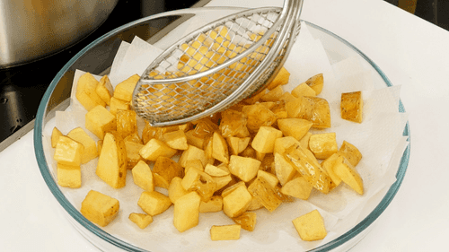 Fry the potatoes until golden-brown. Transfer to paper towels to get rid of excess fat.