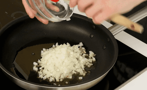 Fry diced onion in olive oil until transparent, adding a little salt.