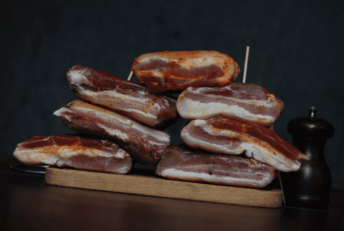 Cut the fat into squares, place them in a container, sprinkle with salt, add bay leaves, peppercorns, and a bit more garlic. Place under a weight and keep for 3-4 days in warmth, then 10 days in the refrigerator.
