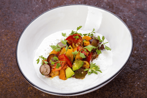 Place stracciatella on a plate, top with seasoned vegetables. Season with salt and pepper, drizzle with olive oil.