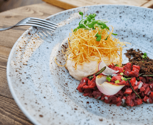 Beef tartare with marinated oyster and shrimp broth