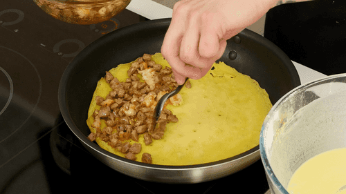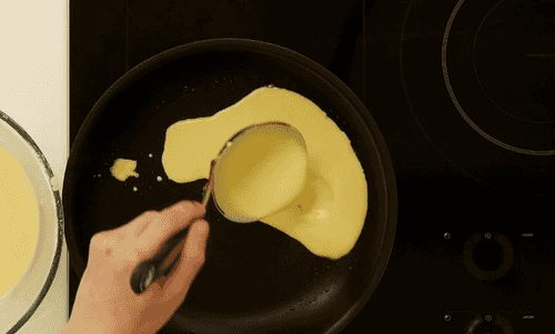 Pour the batter to cover the bottom of the pan. Cook for about 5 minutes until the bottom of the pancake is crispy.