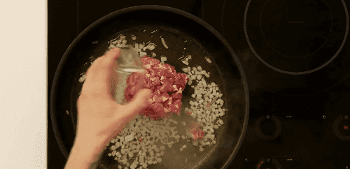 Heat vegetable oil in a pan. Fry the chopped onion.