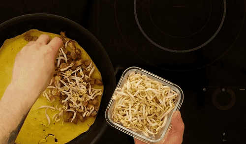 Place some soybean sprouts on top and cover with the free half of the pancake. Do the same with the remaining ingredients.