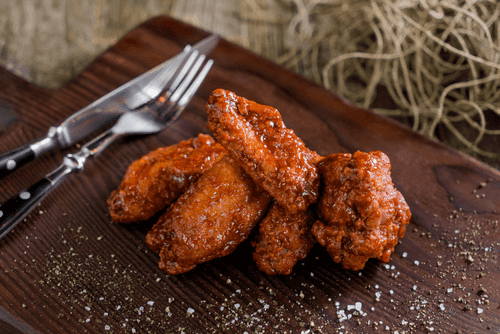 After the wings start to float, they are almost ready. Then use a slotted spoon to place them on a baking sheet, drizzle with sriracha sauce, add butter, and mix.