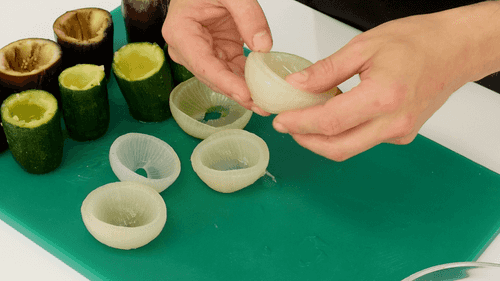 Remove the flesh from the eggplants and zucchini, leaving walls and bottom about a centimeter thick. Place the flesh in a large bowl with the tomato flesh. Separate the onion halves, leaving 2-3 outer layers of skin, and add the inner small layers of the bulbs to the vegetable mixture.