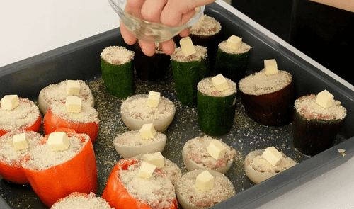 Fill the vegetable cups with minced meat, place them on a baking sheet greased with olive oil. Sprinkle with breadcrumbs, and place a small cube of butter on each vegetable.