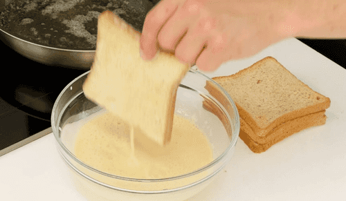 Dip one piece of bread into the egg mixture.