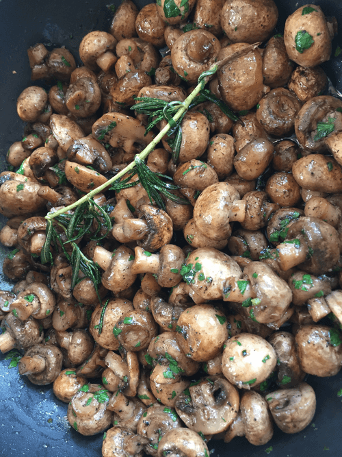 Melt butter in a pan over low heat and cook for about 3-4 minutes until nutty brown. Add minced garlic and a sprig of rosemary. Add roasted mushrooms and mix. Remove from heat.