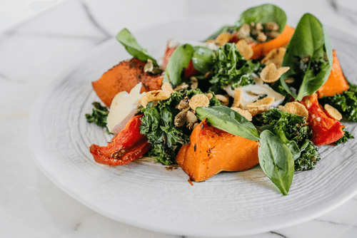 Arrange sun-dried tomatoes, roasted pumpkin, sautéed kale, spinach leaves, and slices of camembert on a plate.